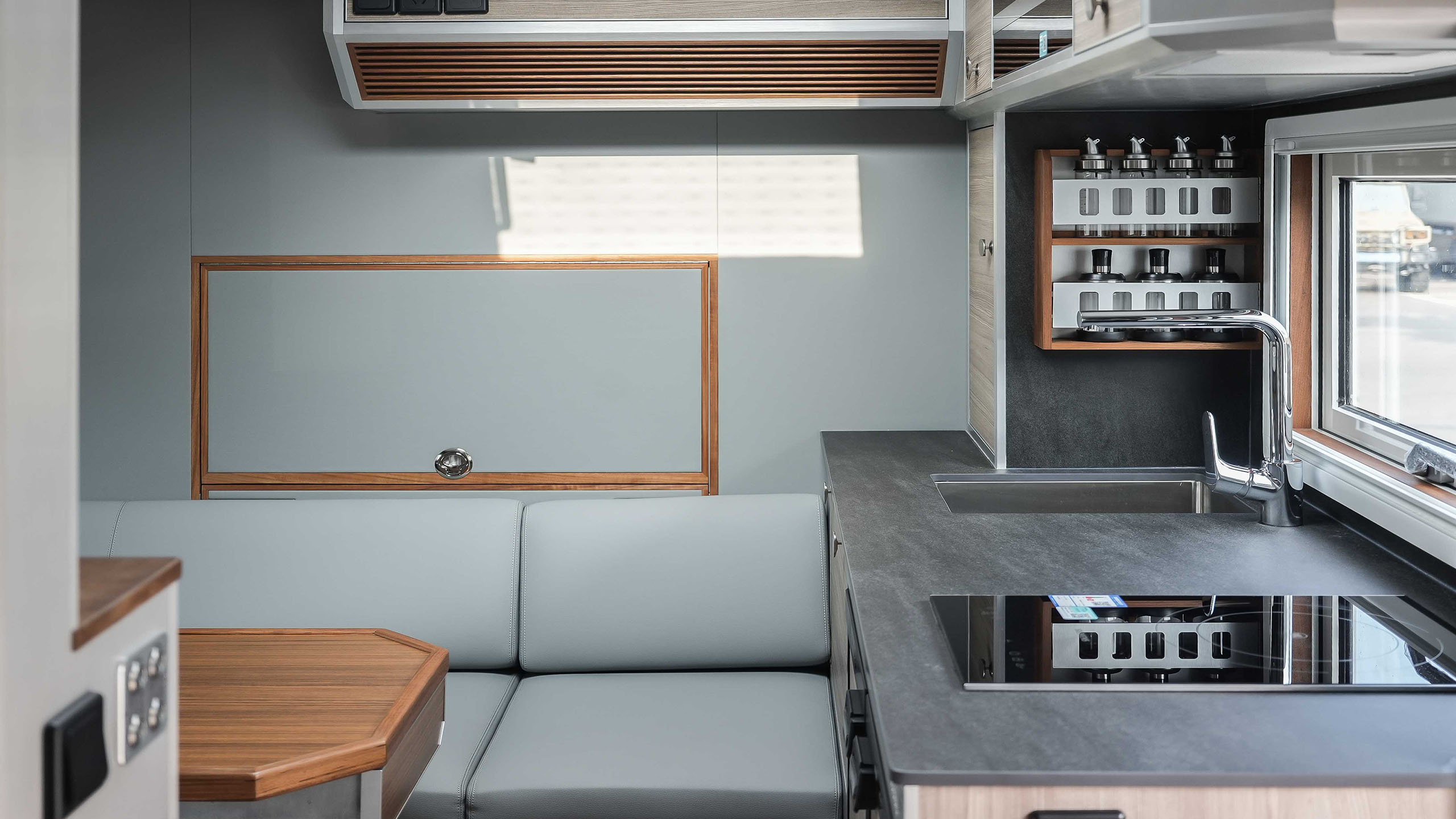 客厅的卡座沙发配上电动升降桌,组合成1,825x1,260mm双人床,客厅顶部隐藏1,858×950mm单人电动升降床