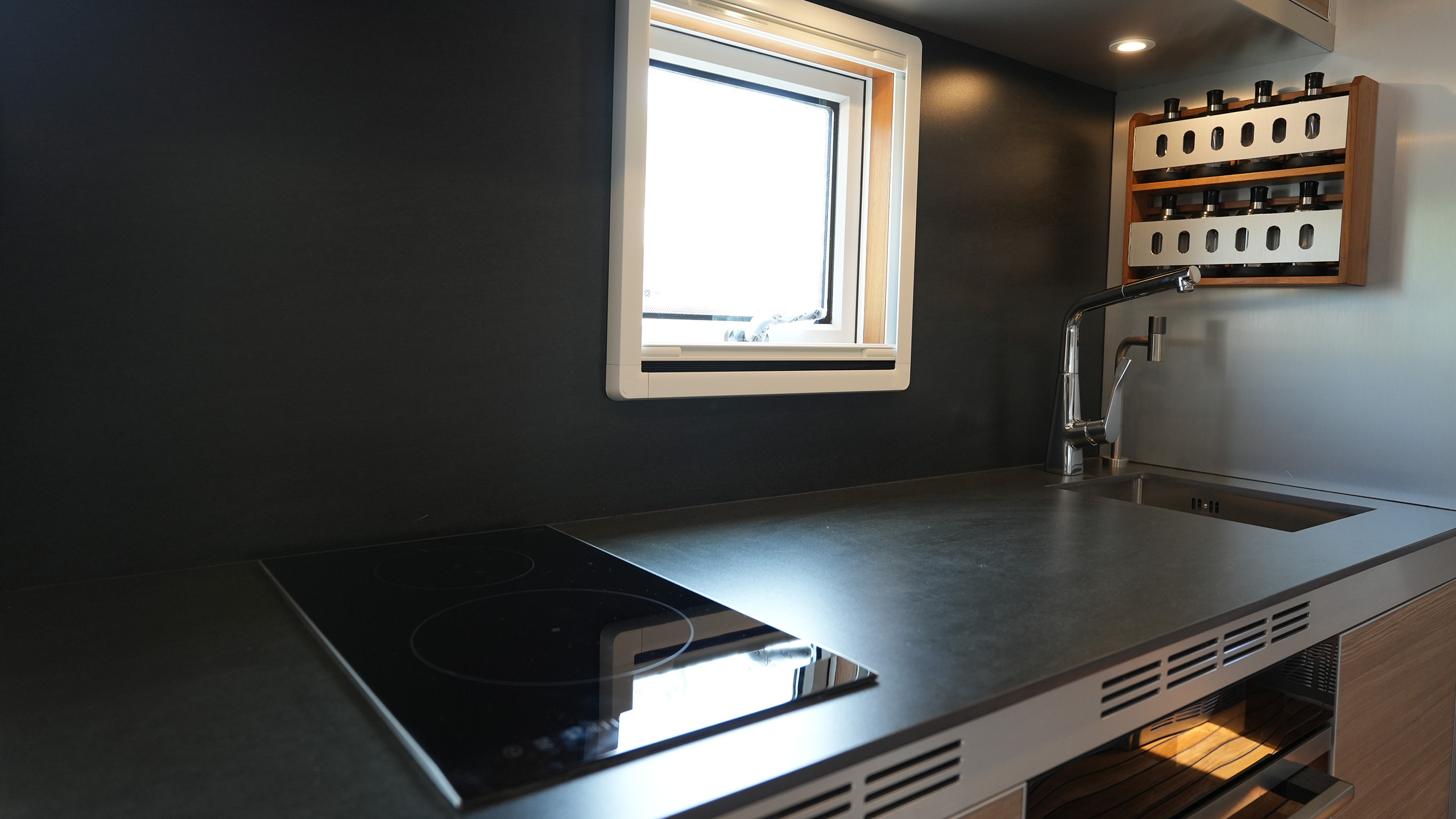 一字型橱柜,深灰岩板台面及原木色柜体,凸显轻奢品质。内嵌式西门子双眼电磁炉、隐藏式排脱油烟机,简约精致。