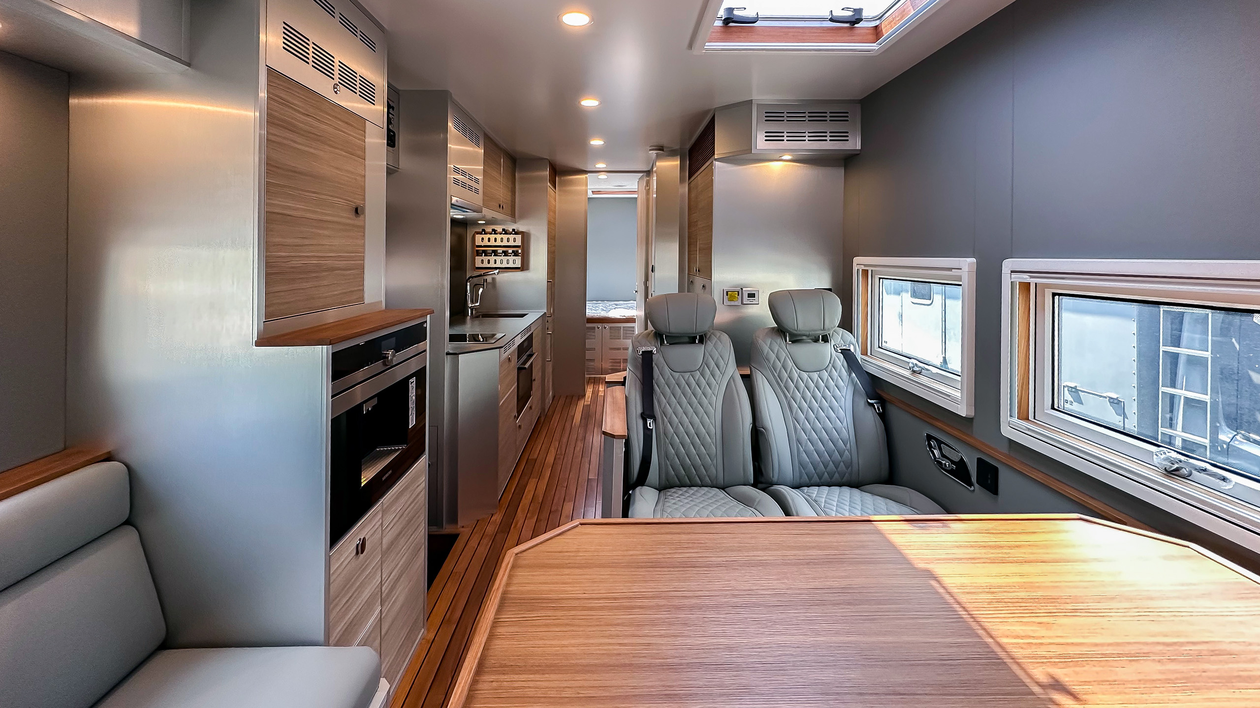 车厢尾部的独立主卧设计独具匠心,配备了2000×1500mm的双人大床,搭配高品质的乳胶床垫,确保了深沉而舒适的睡眠体验。
