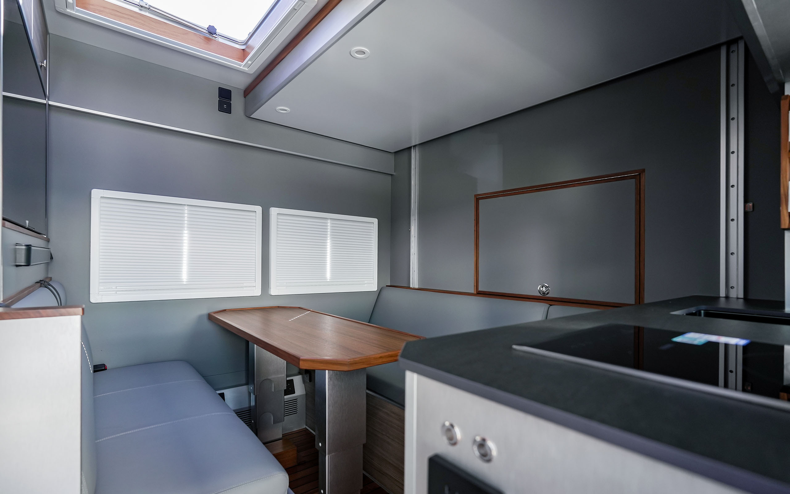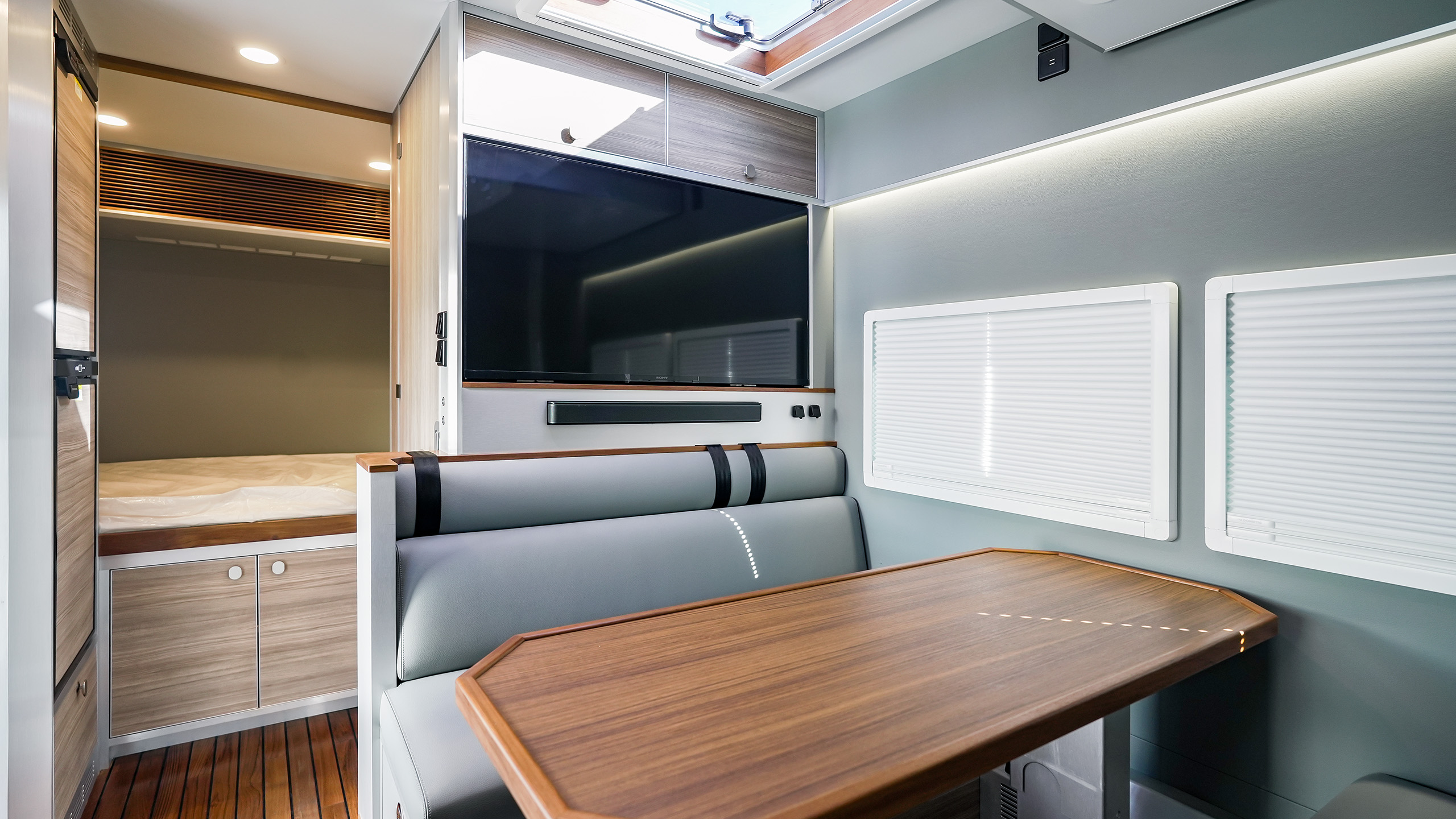 客厅的卡座沙发配上柚木升降桌,可以组合成1900x1240mm双人大床,乳胶沙发垫给你舒适睡眠。客厅顶部一张1900×1000mm的电动升降床,把主、客分区居住都安排妥当。