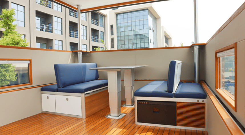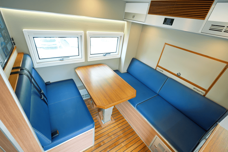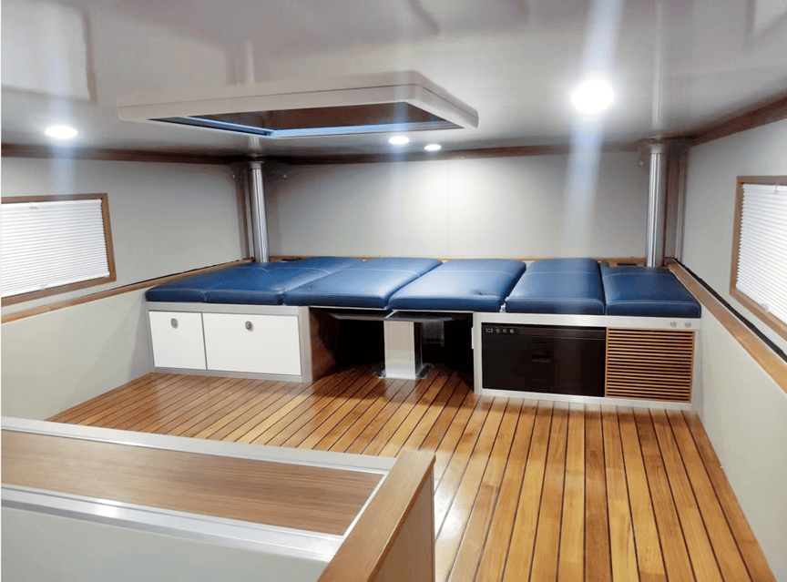 车厢内部的船用柚木地板采用植物油抛光,不仅环保还营造出温馨舒适的居家氛围。