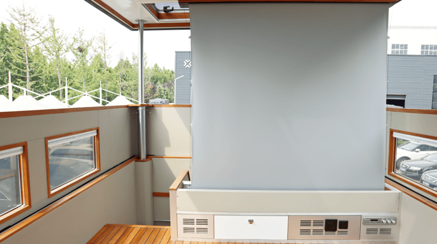 上层区域也是创新性地配备了定制款全频2.1卡拉OK音响系统、高清投影仪和黑晶投影幕布,将飞桥露台变身专业影音室。