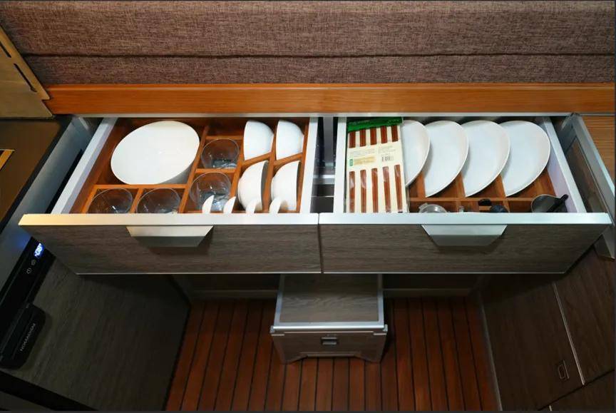 一体化集成的储物柜与餐具柜,把锅碗瓢盆、随身杂物都能妥帖收纳,很大程度节省了车厢空间。