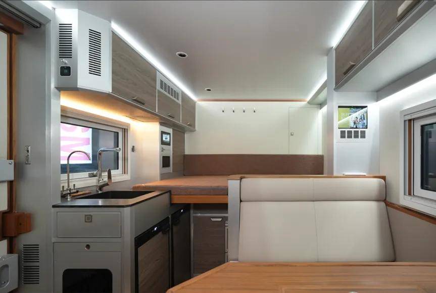 而“撼路者Q”的住宿区惊喜远不止于此,另一处巧思便隐藏在客厅区域,由大家熟悉的卡座沙发与电动升降餐桌组合而成,