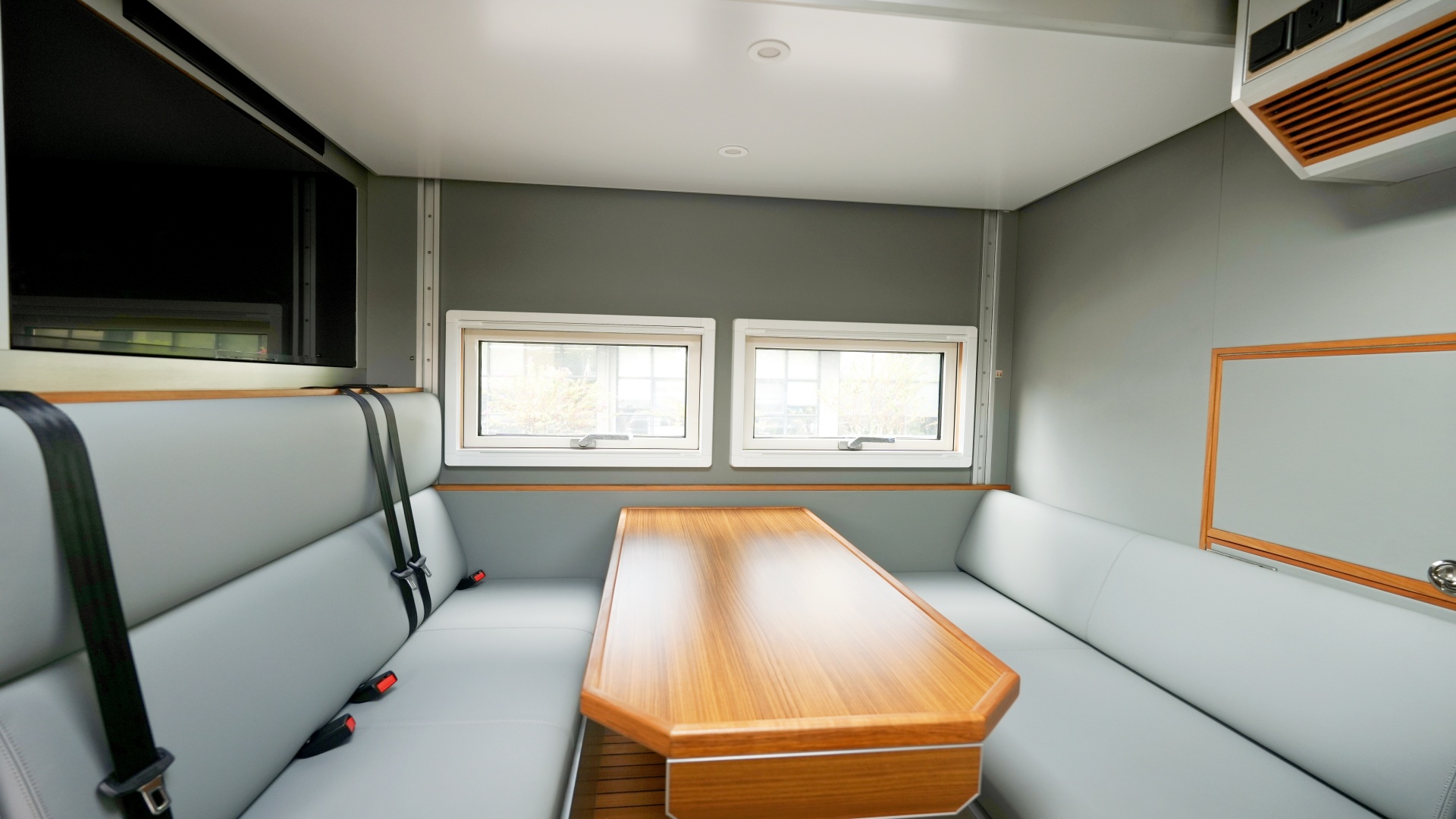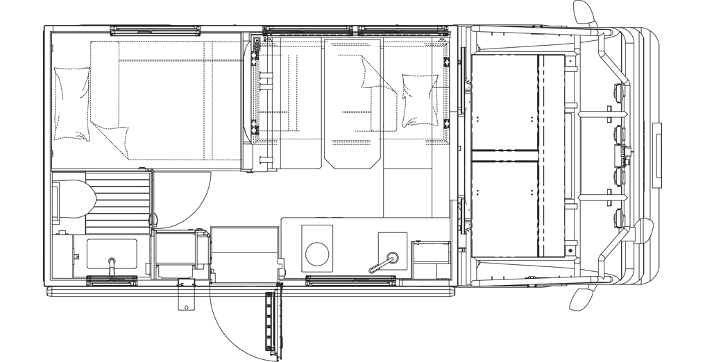 车厢中部设计了独立上下单人卧铺床(上铺1,770×800mm,下铺1,900×800mm),衣柜等,独立空间互不干扰。