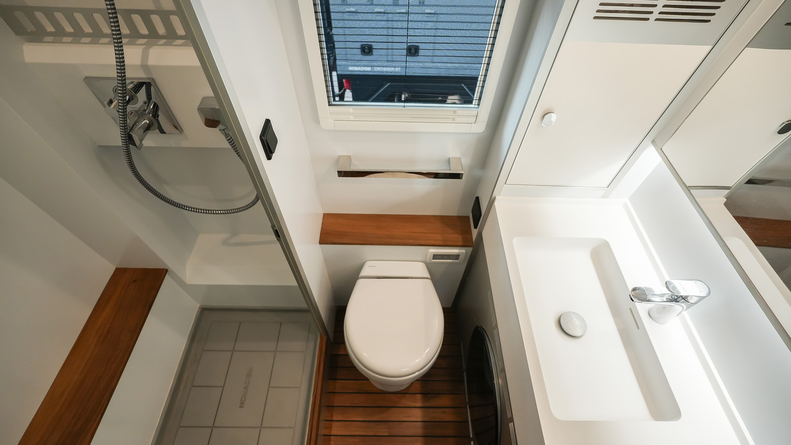 洗手盆、电动粉碎马桶以及淋浴区的巧妙排列,这样的设计充分考虑了使用的便利性与舒适性,使得每个区域都能高效利用,避免了拥挤感。