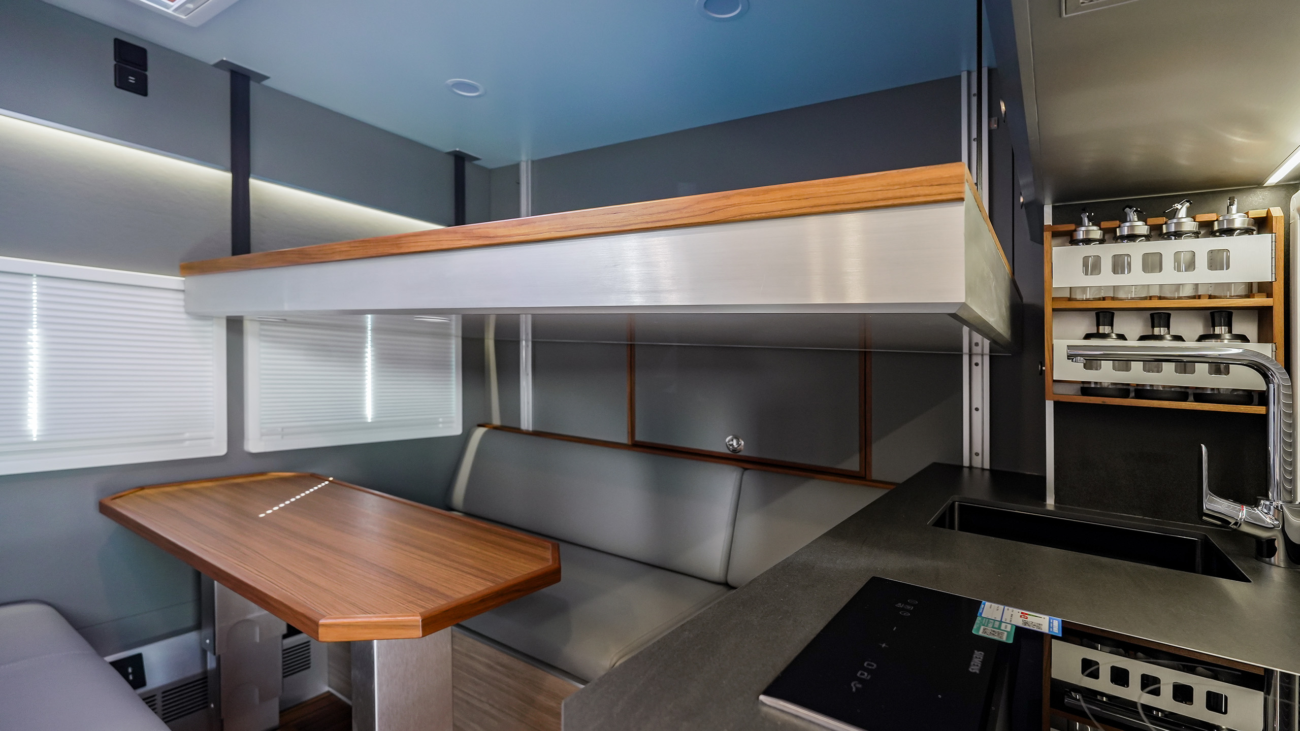 客厅的卡座沙发配上柚木升降桌,可以组合成1900x1240mm双人大床,乳胶沙发垫给你舒适睡眠。客厅顶部一张1900×1000mm的电动升降床,把主、客分区居住都安排妥当。