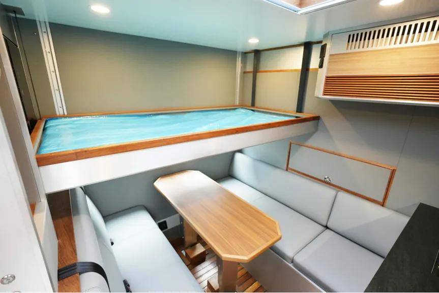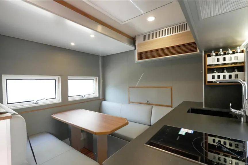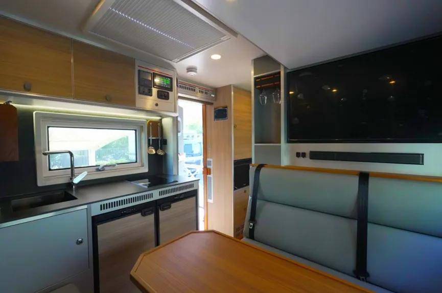 进入生活区,首先映入眼帘的是前部的卡座沙发与电动升降餐桌组合。