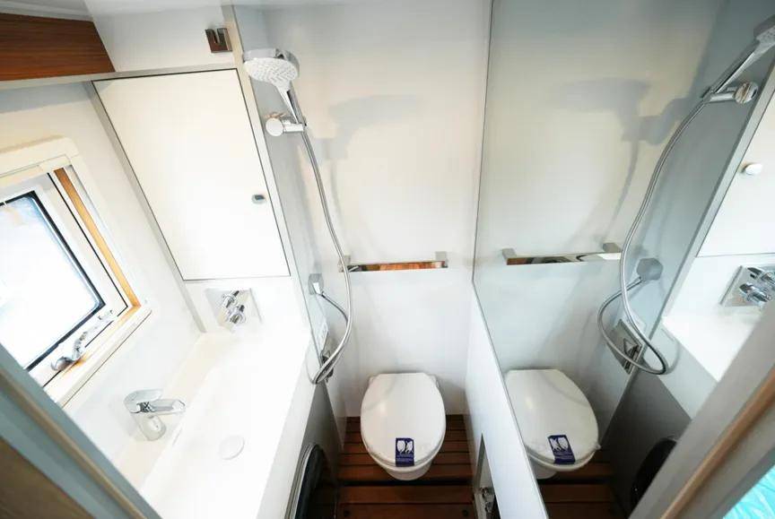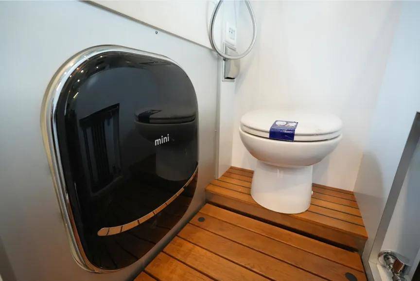 车厢尾部布置的是干湿混合式卫生间。这里集成了洗漱、淋浴和如厕功能,并配备双向通风换气系统。