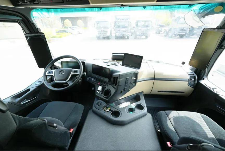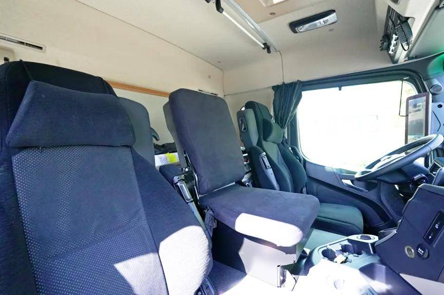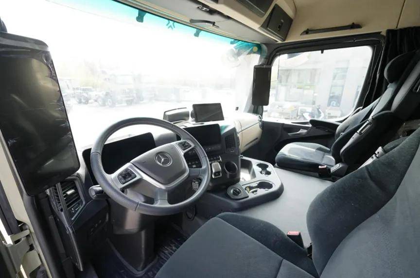 而且前排独立主、副两个驾驶位,座椅是奔驰重卡标志性的十多项调节功能的空气悬挂座椅,
