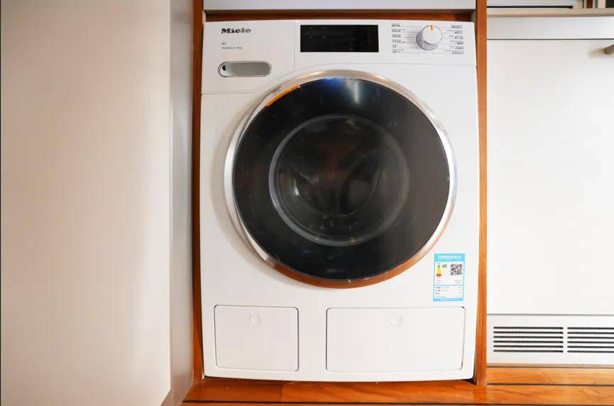 洗衣机安装在了厨房的橱柜内,还是美诺的全自动滚筒洗衣机,让你即使连续穿越30天无人区,